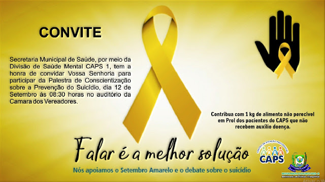 A Secretaria Municipal de Saúde (SEMSAU), por meio da devisão de Saúde mental CAPS 1, realizará dia 12 de setembro palestra sobre a conscientaziçáo e preveção do Suicidio.